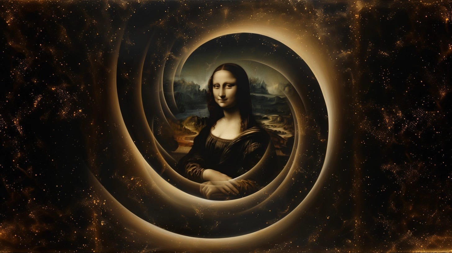 In the swirling depths off a wormhole, Mona Lisa's smile stretches across the fabric of space and time. A testament to the eternal journey of art, and the mysteries that lie just beyond our understanding (for now.)