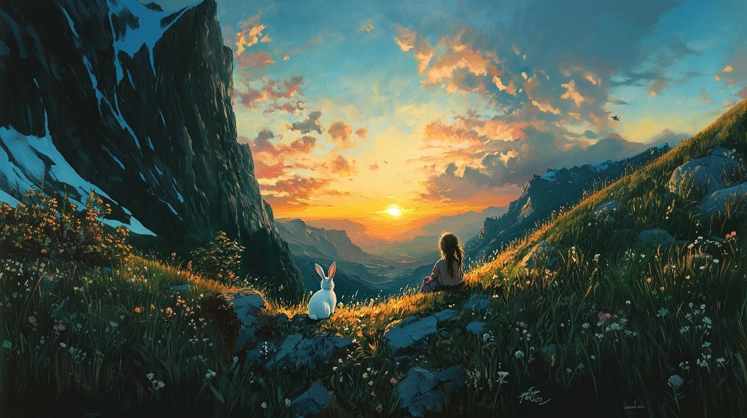 Inspired by the breathtaking nature, the lovely company of the white rabbit, and a glowing inner fire guiding her, she knew that this was just the start of an incredible journey. The world was full of mountains waiting for her to climb them, all she needed to do was have faith, and so the next day began..